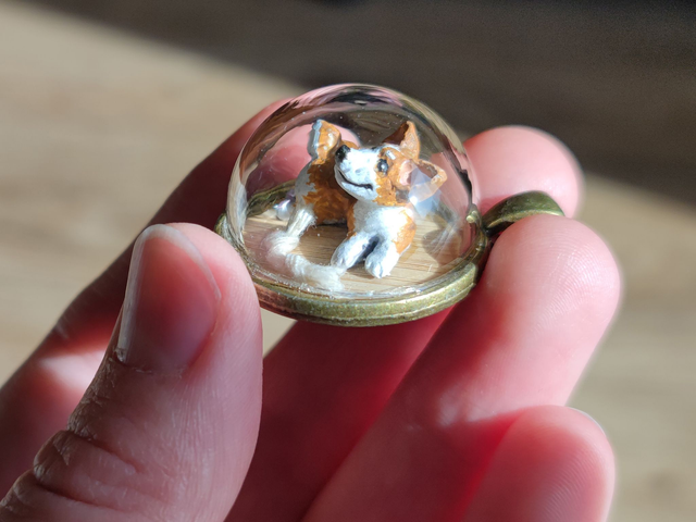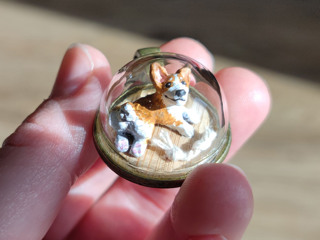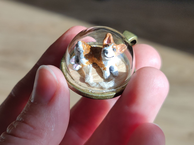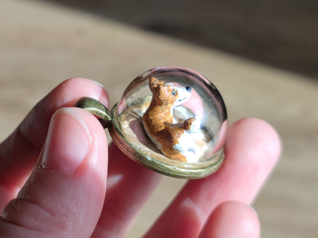 I’ve termed these little glass globes biospheres, as each of them hosts a little environment, which in this case is a meticulously sculpted corgi made from polymer clay and handpainted with acrylics. The chew toy is made from baker’s twine. I added a sturdy glass cap so you can wear this little critter around as you go about your day. There is a possibility of parts to break, if it gets dropped or shaken too much. So please be gentle with it.