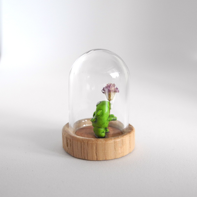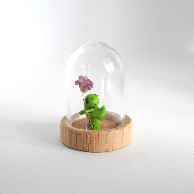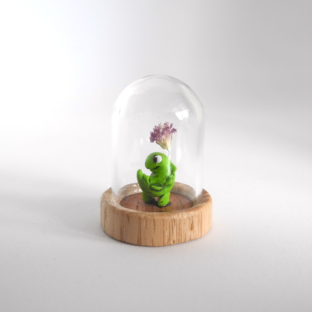 I’ve termed these little glass globes biospheres, as each of them hosts a little environment, which in this case is a tiny dinosaur sculpted from polymer clay and handpainted with acrylics. It is holding a pressed flower. I added a sturdy glass cap so you can wear this little critter around as you go about your day. There is a possibility of parts to break, if it gets dropped or shaken too much. So please be gentle with it.
