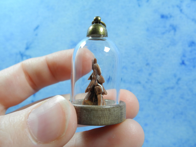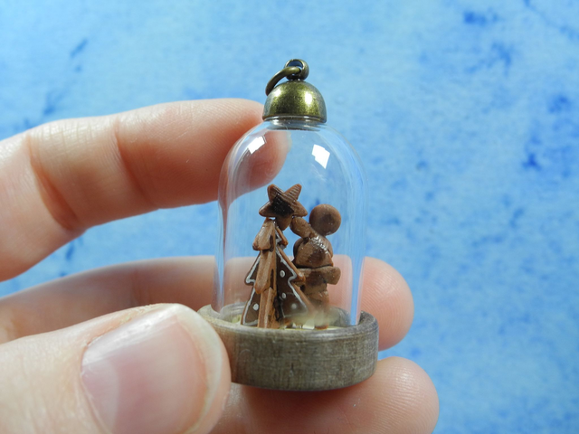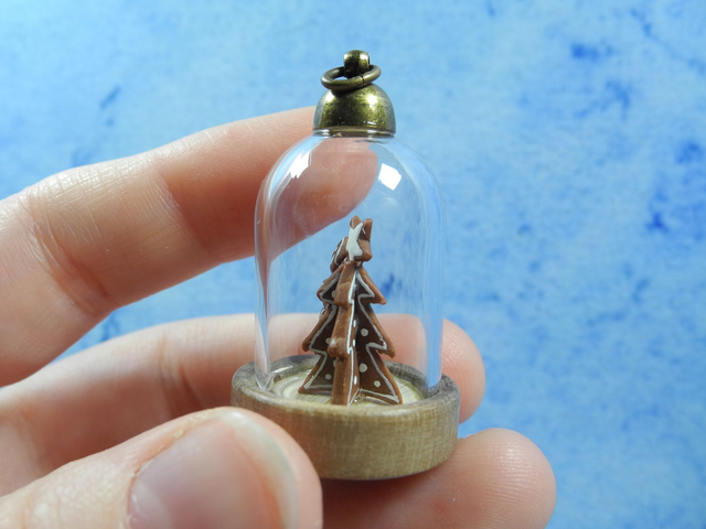 I’ve termed these little glass globes biospheres, as each of them hosts a little environment, which in this case are two gingerbread people and their tree sculpted from polymer clay and handpainted with acrylics. I added a sturdy glass cap so you can wear this little critter around all day. There is a possibility of parts to break, if it gets dropped or shaken too much. So please be gentle with it.