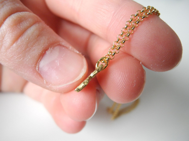 The pendant you see here measures roughly 13mm x 10mm/0.39“ x 0.51”. The chain itself is a gold-plated fine silver chain in a delicate cable style. If your preference is different, write me a message. I’m sure we’ll find a solution.