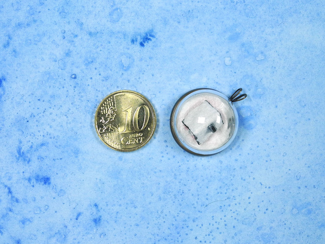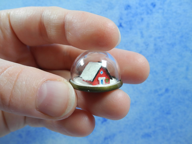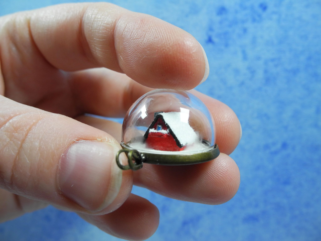 I’ve termed these little glass globes biospheres, as each of them hosts a little environment, which in this case is a tiny house that has been crafted from paper, meticulously handpainted with acrylics and adorned with heaps of modelling snow. I added a sturdy glass cap so you can wear this little critter around as you go about your day. There is a possibility of parts to break, if it gets dropped or shaken too much. So please be gentle with it.