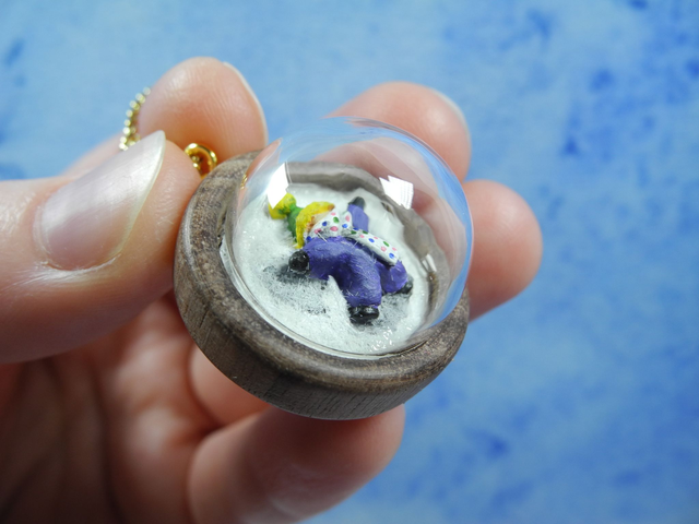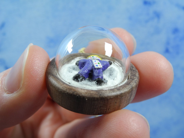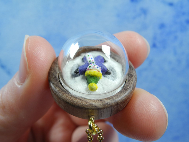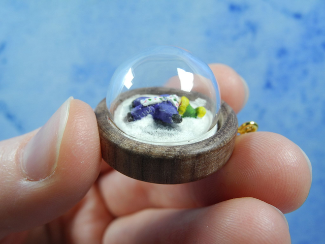 I’ve termed these little glass globes biospheres, as each of them hosts a little environment, which which in this case is a child sculpted from polymer clay, meticulously handpainted with acrylics and adorned with heaps of modelling snow. I added a sturdy glass cap so you can wear it around as you go about your day. There is a possibility of parts to break, if it gets dropped or shaken too much. So please be gentle with it.