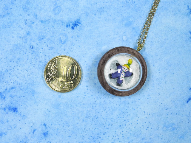 This little pendant hosts a child enthusiastically making a snowangel in freshly fallen snow. To pose a colourful contrast against the pristinely white snow it is wearing a purple ski suit and brightly coloured hat and scarf. It is the perfect piece of jewelry to carry your favourite season with you all year round!