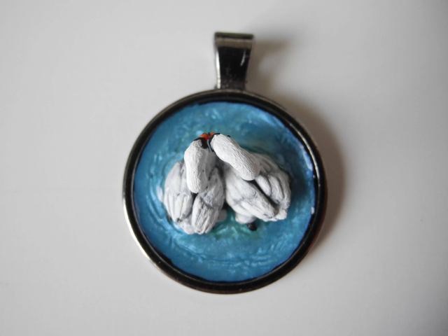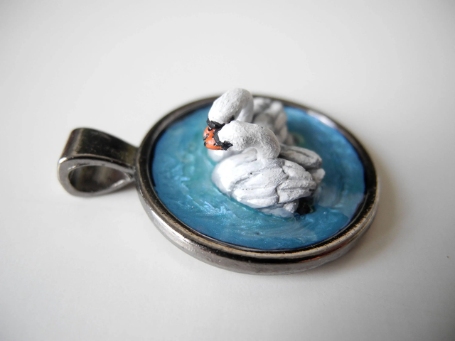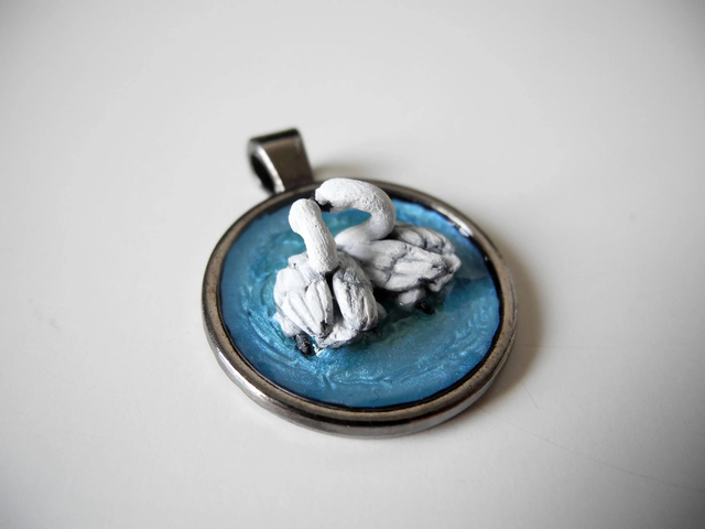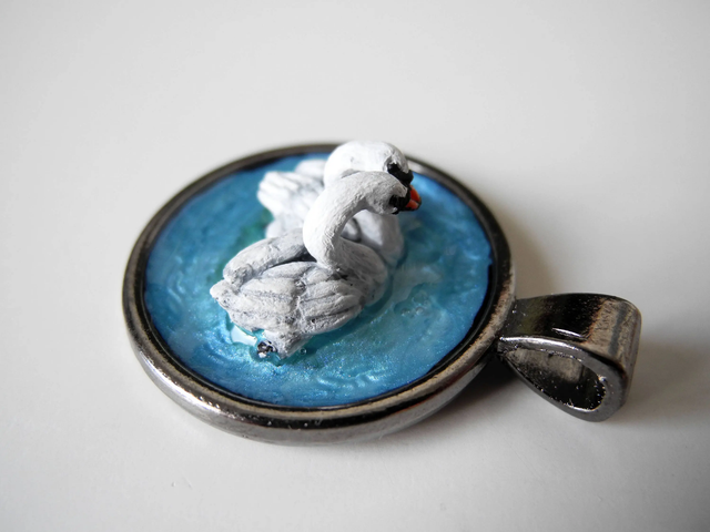 I’ve termed these little glass globes biospheres, as each of them hosts a little environment, which in this case are two graceful little swans sculpted from polymer clay which swim on a lake made from various resins. I added a sturdy glass cap so you can wear this little critter around as you go about your day. There is a possibility of parts to break, if it gets dropped or shaken too much. So please be gentle with it.