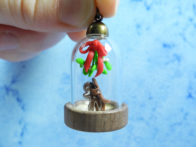 I’ve termed these little glass globes biospheres, as each of them hosts a little environment, which in this case are two gingerbread people and a mistletoe sculpted from polymer clay and handpainted with acrylics. I added a sturdy glass cap so you can wear this little critter around all day. There is a possibility of parts to break, if it gets dropped or shaken too much. So please be gentle with it.